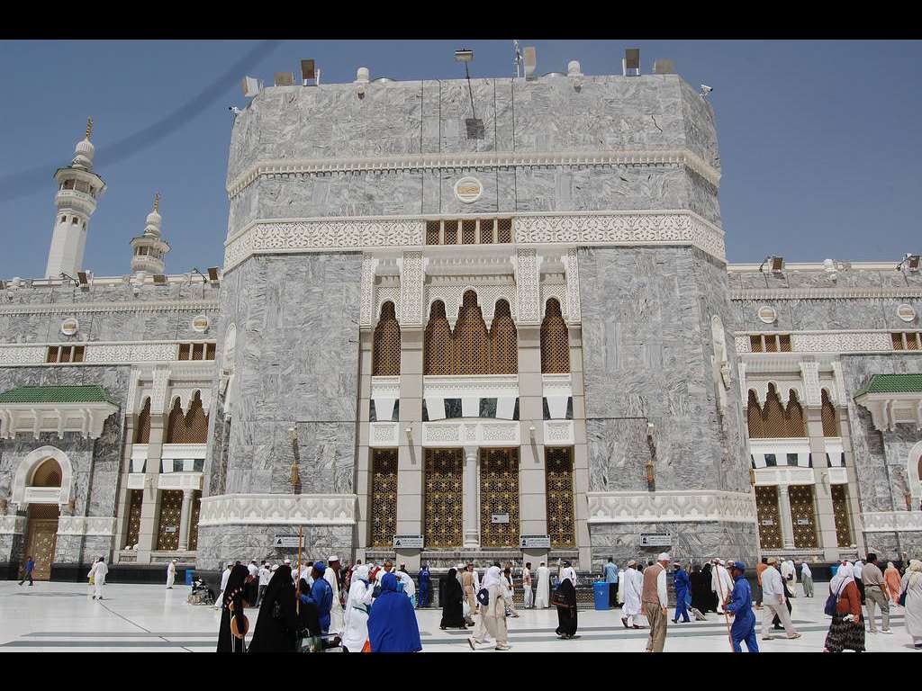 Masjid al-Haram was built around the Kaaba. It is also the largest mosque in the world. It was first built under the leadership of the Caliph Omar Ibn al-Khattab (634-644) and has been modified continuously under several Muslim rulers. Omar, the first Caliph, ordered the demolition of some houses surrounding the Kaaba in order to accommodate the growing number of pilgrims and built a 1.5 meter high wall to delineate a large prayer area. During the reign of his successor Caliph Uthman Ibn Affan (644-656), the prayer space was enlarged and was covered with a roof carried on wooden columns and arches. In 692, after Caliph Abdul Malik bin Marwan conquered Mecca from Ibn Zubayr, the guardian of the holy site, the outer walls of the mosque were raised, the ceiling was covered with teak and the column capitals were painted in gold. His son, al-Walid (705-715), contributed to the Mosque of al-Haram by replacing the wooden columns with marble ones and by decorating its arches with mosaics. Later, Abbasid Caliph Abu Ja’far al-Mansur (754-775) added mosaics to the columns. He also doubled the size of the northern and western wings of the prayer hall and erected the minaret of Bab al-Umra on the northwest corner. In 777, due to the growing number of pilgrims, Abbasid Caliph al-Mahdi (775-785) ordered the rebuilding of the mosque, demolishing more houses around the Kaaba. The new mosque enclosure centered on the Kaaba, measured 196 meters by 142 meters. It was built on a grid plan, with marble columns from Egypt and Syria, decorated with gilt teak wooden inlay. Al-Mahdi also built three minarets crowned with crenellations and placed above Bab al-Salam, Bab Ali and Bab al-Wadi of the mosque.